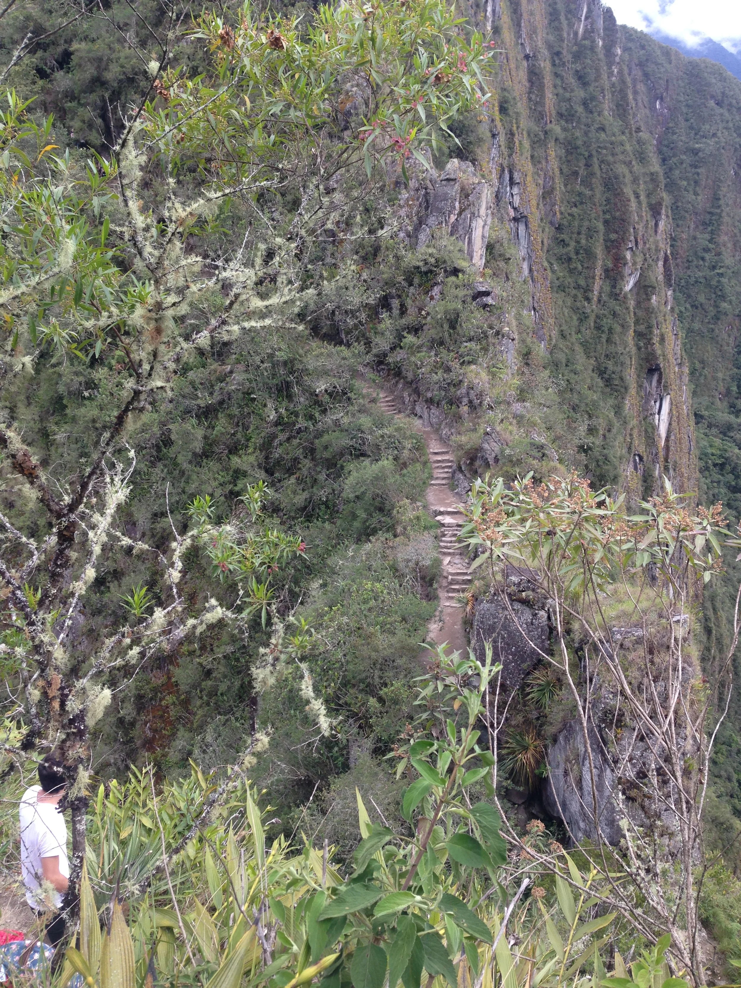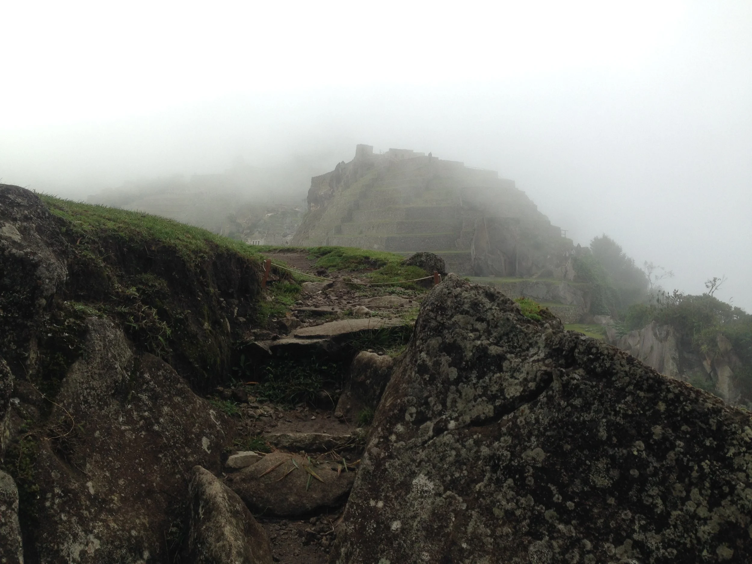 At that hour, visibility is still low. The entire citadel is wrapped in breathing fog. We crossed the park and reached the entrance to Huayna Picchu. The climb is stunning but risky—the stone steps slick with dew, the rails cold and wet. Near the top, I used all four limbs to climb safely. What a climb!